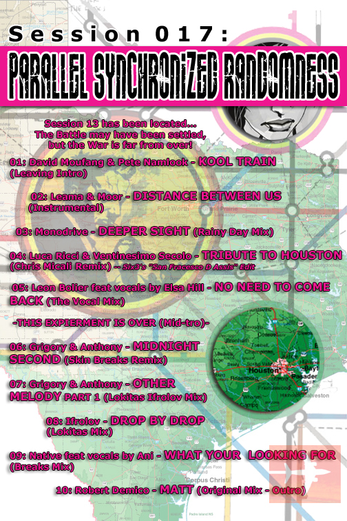 Main l Weekly Mix l Archive Mixes l Contact ARCHIVED MIXES ===================================================== ===================================================== ==================================================== ===================================================== ===================================================== ===================================================== ===================================================== ===================================================== ===================================================== SESSION 012: STRONG IN THE MIDDLE RIGHT CLICK AND SAVE AS 02: Detacher - ELONGATION 03: Detacher - TEST BY TEST 04: Brandon Moser - AZURE DEEPS (Lanch Cashion Mix) 05: The Emissary - SYNAPSE 06: Retroid - FORBIDDEN WORLD (Brace Mix) 07: Beatman, Ludmilla - COULDN'T SLEEP 08: Retroid - DAYBREAK (Nieghel's NuSkool Mix) ===================================================== SESSION 011: PROTECTION FROM GLASS Genre of Choice this week: Progressive/Atomspheric/Techie House Tracklisting: 01: DJ Fresh - THE LOOKING GLASS 02: Michael Anthony - INTO THE NIGHT (Deep Groovy Mix) 03: Kyma - HOPE 04: Paolo Le Grand - STORY (Moonbeam Mix) 07: Tiefschwarz feat. Tracey Thorn - DAMAGE (The Buick Project Mix) ===================================================== SESSION 010: EFFECTIVE ONE Genre of Choice this week: Progressive Breaks Tracklisting: 01: Cassino & Laben feat. Marina Puglisi - LASTING MEMORIES 02: 3 Colours - THE OTHER WORLD 03: Bram Valeryo - EFFECTIVE (Nexar Remix) 04: Infusion - LEGACY (JunkieXLMix) 05: Viton & Stel - Wooden Swordz (Jose Zamora And Dousk Mix) 06: Momu - ONE ===================================================== SESSION 009: 2 Countries, 2 West Banks, & 2 Exiles Genre of Choice this week: Some of that "Boderline" Trance/Progressive Stuff Tracklisting: 01: Nikola Gala - SWING 2 HARMONY (Jose Zamora & Dousk Remix) 02: Sertac Kaya - ULTIMA (Hakan Unsal's Ultima Tone Mix) 03: James Benitez - MISS THING (Future Tribal Mix) 04: Nikola Gala & Chris Mozio - A DREAM CAME TRUE 05: Joel ArmStrong - SILVER MOON (Derek Howell Remix) 06: Jeff Devas - CRESCENT CITY EXILE 07: Sertac Kaya - ELUSIVE (Chris Conner Juxy Remix) 08: Jeff Devas - ELECTRIC CRASH ===================================================== SESSION 008 - NO DRESS CODE REQUIRED: Music by and for Individuals Genre of Choice this Week: Deep House w/ a pinch of Jazz, Funk, Tech and Soul